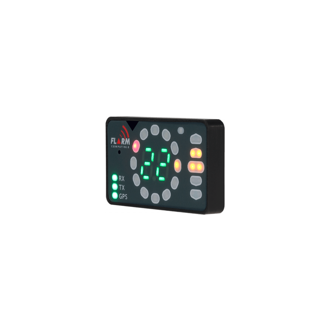 Le FlarmLED+ de LXNAV permet une visualisation graphique simple et directe des trafics dangereux aux travers d’un système de LED bicolores et d’une indication de distance du trafic (en Km, Nm ou Miles). En cas de détection d’un danger, l’alarme visuelle est accompagnée d’une alarme sonore dont le volume est réglable. Si plus d’un aéronef est à proximité, la cible la plus proche sera affichée avec une LED jaune en permanence. Les autres cibles clignotent alors en jaune. La distance et la LED permanente indiqueront toujours la cible la plus proche. Le bouton central (situé là où la distance s’affiche) est de technologie « Touch Pad » et remplace le bouton-poussoir des précédents modèles. Il permet de : régler le volume de l’alarme sonore et La taille très compacte de cet afficheur Flarm LED+ permet de l’installer dans des tableaux de bord étroits ou au-dessus de la casquette des instruments sans bloquer la vue. Pour les biplaces, il est possible de connecter 2 FlarmLED+ au même Flarm via un FLARM splitter. Le FlarmLED+ est livré avec son câble.