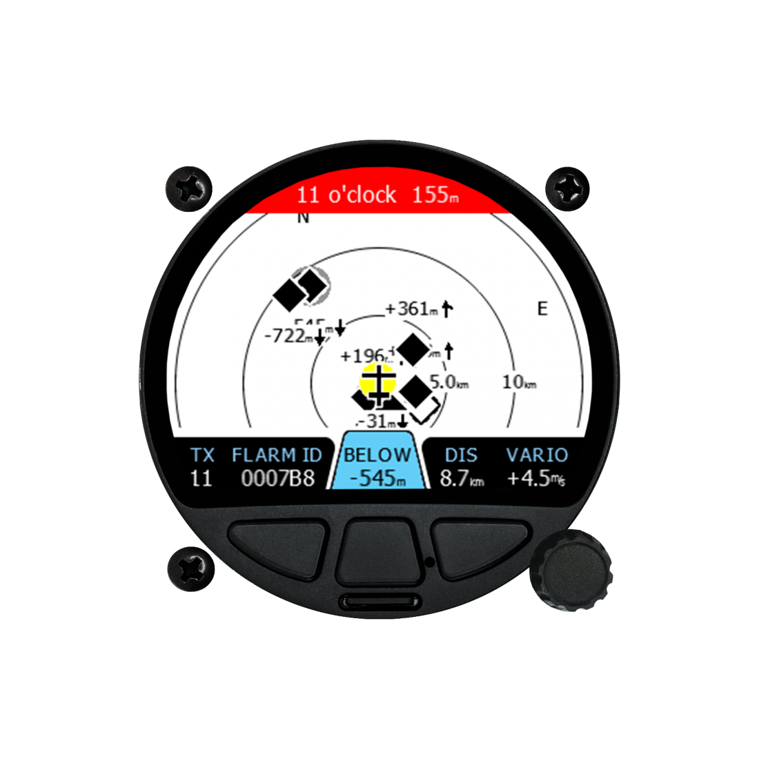 TrafficView affiche les informations de traffic fournies par les appareils FLARM/PowerFLARM ou ADS-B A/C. Des fonctionnalités telles que la nouvelle vue d'alerte, la vue d'alerte frontale et également une vue TCAS vous aideront à voir autant d'informations dont vous avez besoin pour avoir une conscience totale de votre environnement. TrafficView affiche également le taux de montée, l'altitude et la distance pour les cibles sélectionnées et utilise la base de données FLARMNET pour les noms de cibles. Toutes les manipulations se font via un encodeur rotatif et 3 boutons poussoirs.