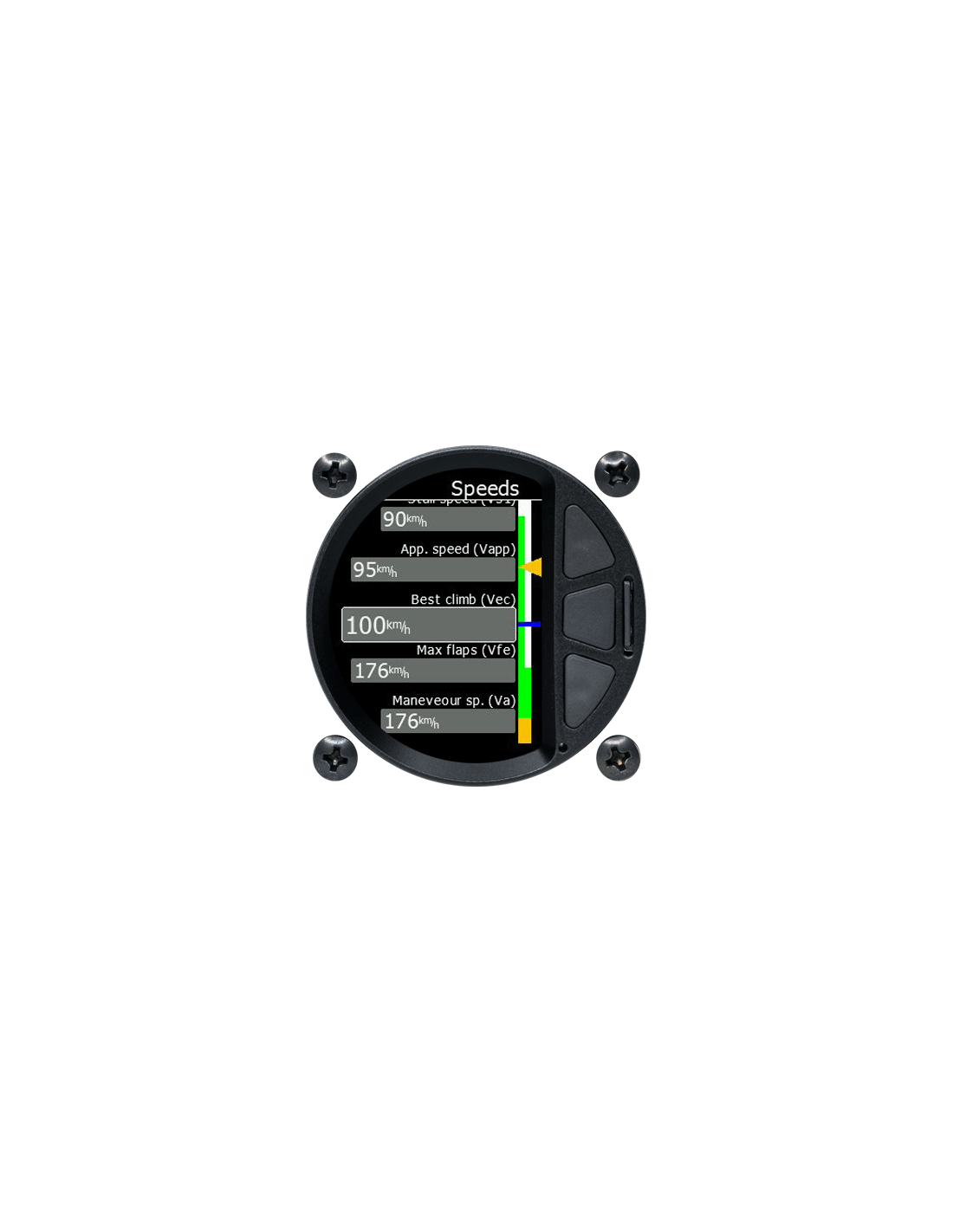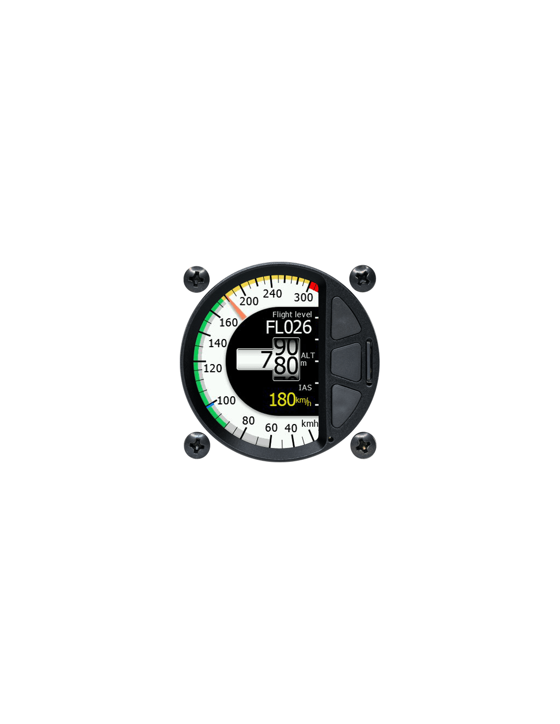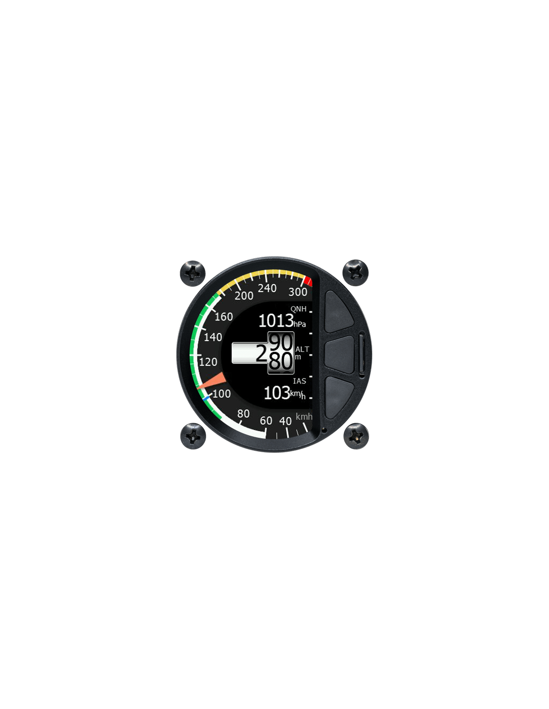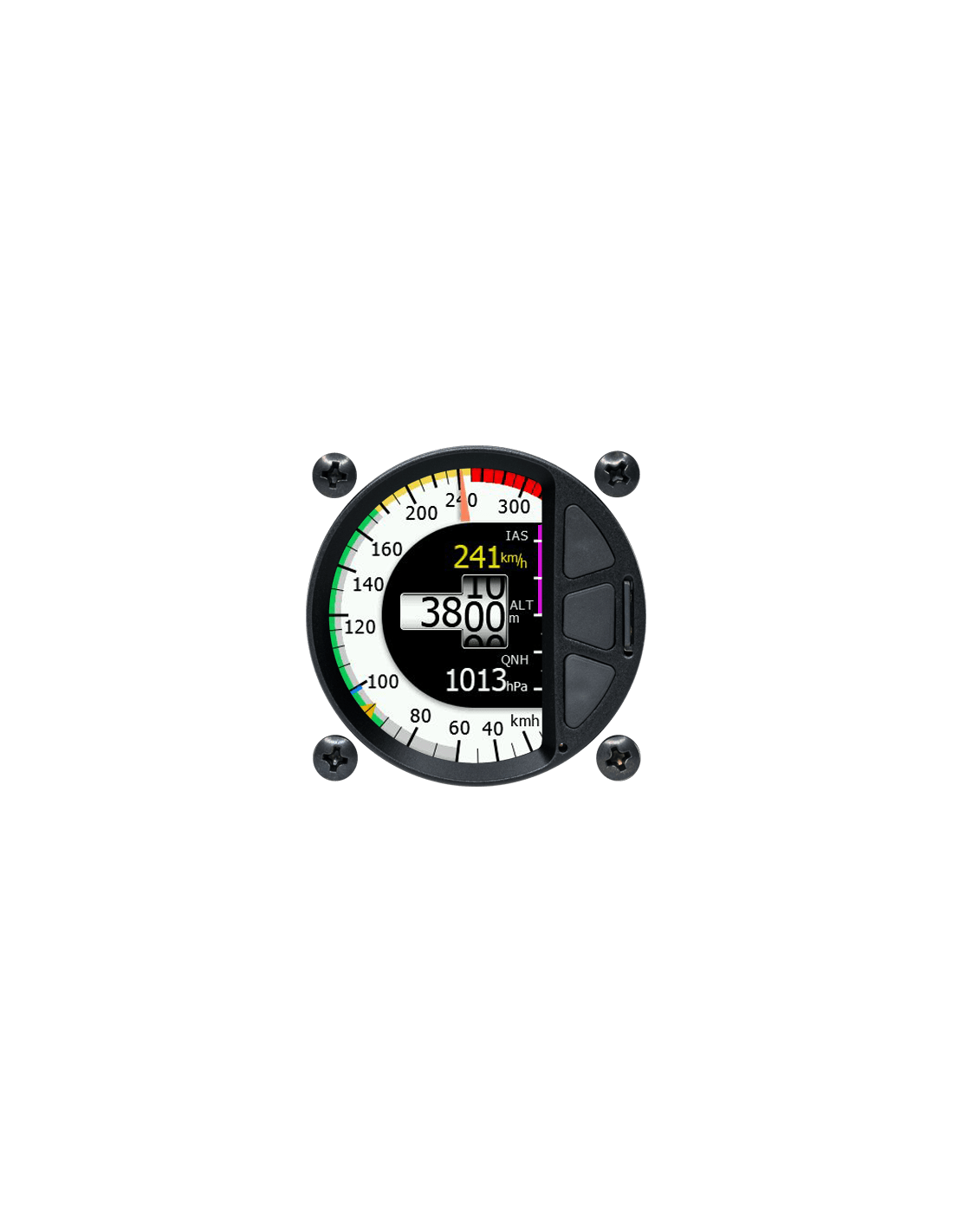 Indicateur numérique autonome de vitesse et d'altitude. Indique la vitesse, l'altitude et la vitesse verticale avec des capteurs de pression numériques intégrés de haute précision (50 échantillons par seconde). L'unité a une dimension standard de 57 mm de diamètre (80 mm en option). 3 boutons poussoirs sont utilisés pour modifier le QNH et pour gérer et configurer l'indicateur AirData. ADI prend en charge la personnalisation de l'échelle de vitesse, y compris la vitesse Vne en fonction de l'altitude. Interface utilisateur intuitive permettant également de définir la vitesse calibrée, le décalage de température, les filtres de vitesse verticale et de nombreux autres réglages.