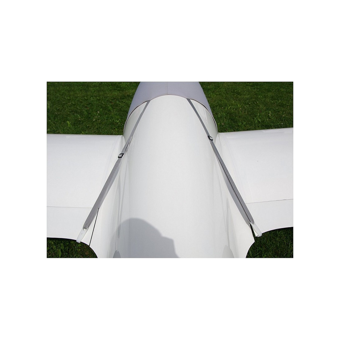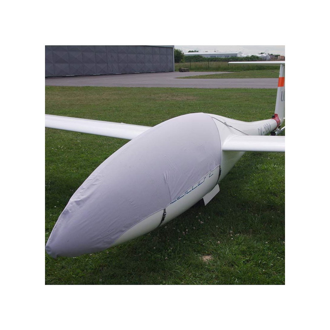 Le couvercle est fixé au fuselage par le nez et par quatre ou cinq sangles (biplace). Deux sangles avec des crochets en plastique fixent les bords de fuite des ailes, le restant autour du côté bas du fuselage. La couleur est un gris clair élégant, la housse peut être lavée en machine à laver (40°C).
