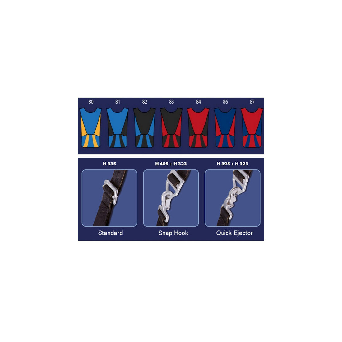 Charge maximale autorisée : 115 kg - Hauteur de saut minimale: 100 m AGL - Poids: 6.8kg (standard); 7,3 kg (mousqueton), 7,4 kg (éjecteur rapide)+ 0,2 kg pour libération forcée.
