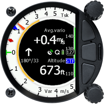 3 capteurs pneumatiques fournissent une compensation électronique ou TE et une plateforme inertielle intégrée avec accéléromètre +-8g et 3 gyroscopes pour des mesures vario rapides et des calculs précis du vent. L'option logicielle AHRS en option permet d'afficher une page graphique d'horizon artificiel.