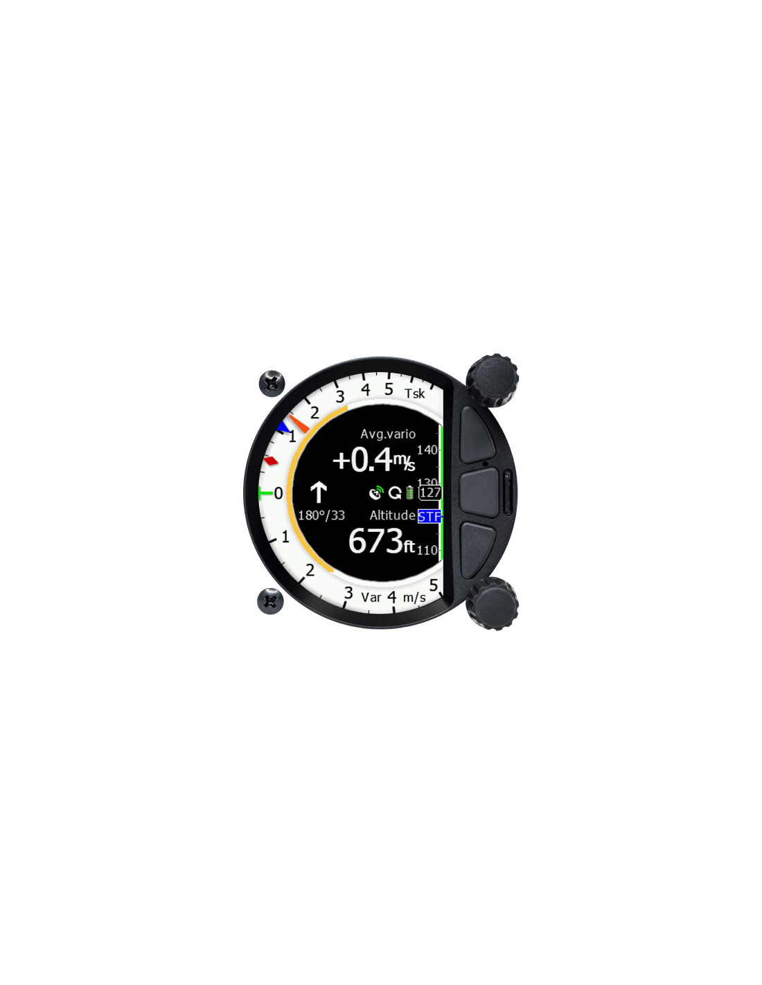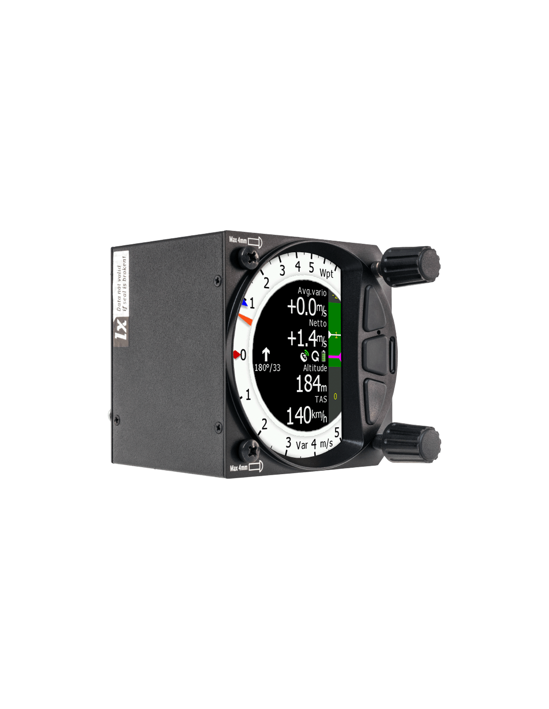 L'aiguille d'indication vario est entièrement numérique sur un écran antireflet extrêmement lumineux de 3,5 pouces avec une fréquence d'images très élevée de 60 Hz. Il s'insère dans un trou standard de 80 mm dans le tableau de bord.
