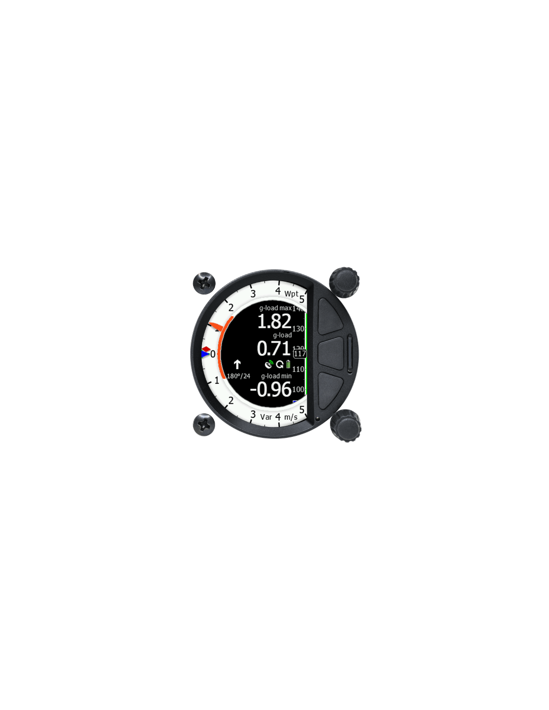 Plateforme inertielle intégrée avec accéléromètre +-8g. L'appareil affiche la charge g actuelle dans la boîte de navigation/l'aiguille et ses valeurs min-max en barre. Les boîtes de navigation de charge min/max du dernier vol sont persistantes jusqu'au prochain vol. Des informations très utiles pour les vols acrobatiques.